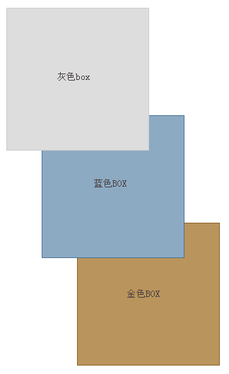 現(xiàn)在的結(jié)果是我們所期待的了:這些元素的層疊順序?qū)崿F(xiàn)了反向;灰色的BOX覆蓋在藍(lán)色之上,藍(lán)色的覆蓋在金色之上。