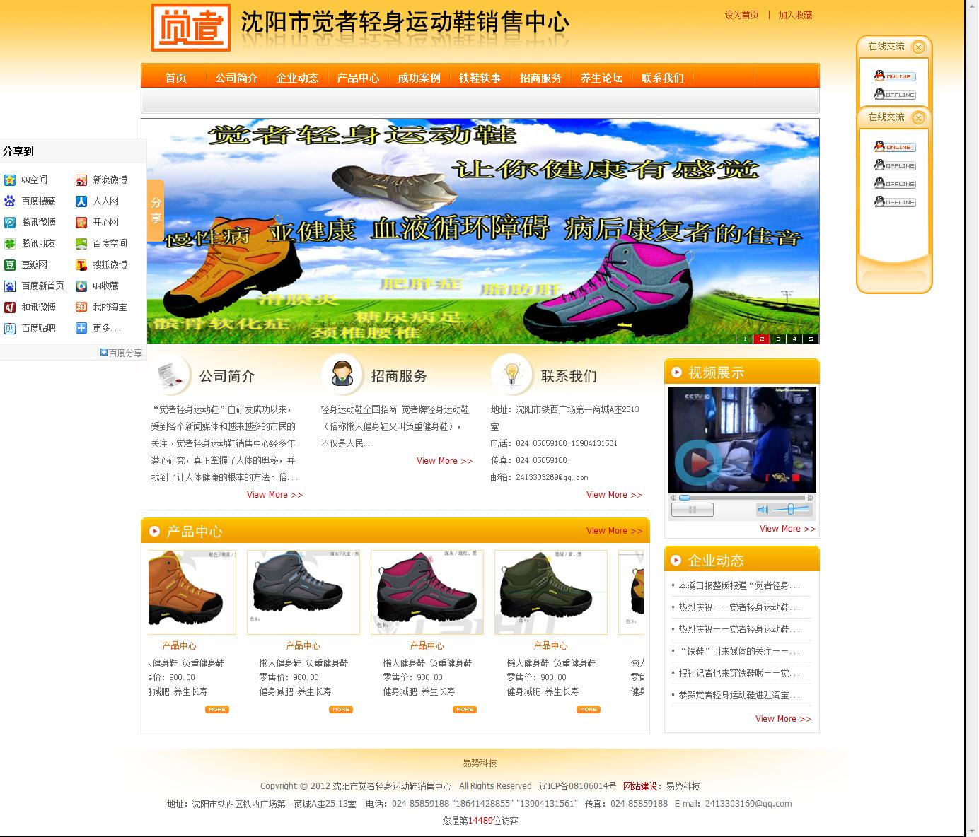 網(wǎng)站簡(jiǎn)介: 覺者輕身運(yùn)動(dòng)鞋銷售中心致力于開發(fā)能從根本上解決人們健康問題的健身產(chǎn)品?!坝X者輕身運(yùn)動(dòng)鞋”俗稱懶人健身鞋,也叫負(fù)重健身鞋,是公司的第一代產(chǎn)品,于2012年1月申請(qǐng)國(guó)家專利,產(chǎn)品于2012年9月1日正式上市。沈陽(yáng)市覺者輕身運(yùn)動(dòng)鞋銷售中心的網(wǎng)站主要有8個(gè)板塊,支持在線咨詢、在線視頻、產(chǎn)品展示等功能。網(wǎng)站首頁(yè)有在線咨詢浮動(dòng)窗口,用戶在瀏覽網(wǎng)站的過程中,如果遇到任何問題,可以通過此功能同企業(yè)的客服取得聯(lián)系,企業(yè)會(huì)盡快給予回復(fù),幫助解決問題,加強(qiáng)了企業(yè)同用戶之間的溝通和聯(lián)系。公司主要通過企業(yè)動(dòng)態(tài)板塊來發(fā)布該行業(yè)相關(guān)資訊和企業(yè)的最新動(dòng)態(tài)。同時(shí),首頁(yè)以圖片跑馬燈的方式展示了公司的運(yùn)動(dòng)鞋,并且標(biāo)明了運(yùn)動(dòng)鞋的售價(jià)和主要功能,使瀏覽網(wǎng)站的用戶對(duì)運(yùn)動(dòng)鞋的外觀、售價(jià)、功能有所了解。