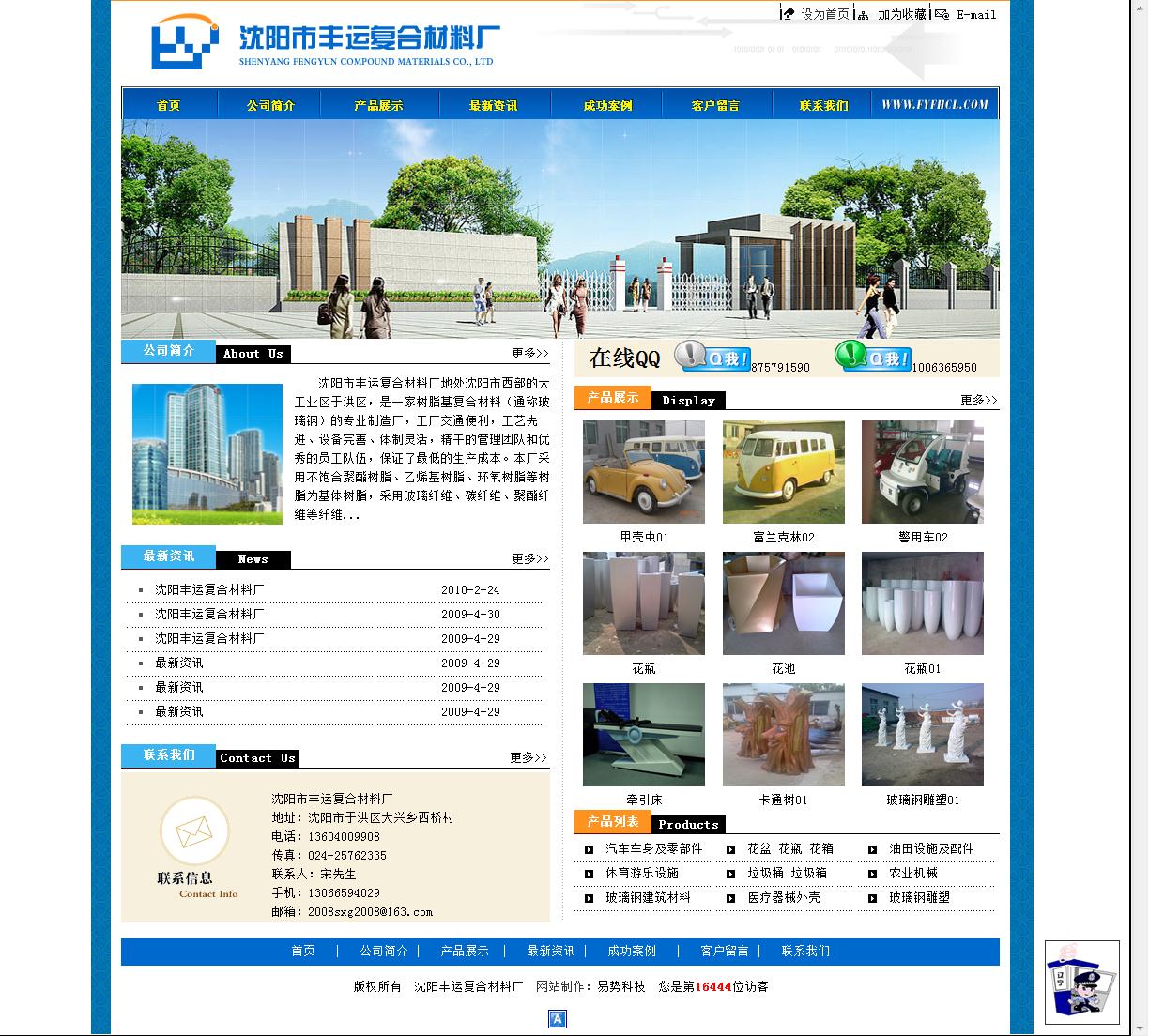 網(wǎng)站簡介: 沈陽市豐運(yùn)復(fù)合材料廠是一家樹脂基復(fù)合材料(通稱玻璃鋼)的專業(yè)制造廠,生產(chǎn)各種玻璃鋼機(jī)器設(shè)備外殼、汽車車身、體育游樂設(shè)備、電力設(shè)備外殼、航空器材、垃圾桶、垃圾箱、施肥播種箱、施肥箱、醫(yī)療器械外殼等產(chǎn)品。沈陽豐運(yùn)復(fù)合材料廠的網(wǎng)站主要有6個(gè)板塊,支持在線咨詢、案例展示、信息發(fā)布等功能。產(chǎn)品展示板塊以圖片的方式對(duì)公司的產(chǎn)品進(jìn)行展示,而且在側(cè)邊欄有產(chǎn)品分類,瀏覽網(wǎng)站的用戶可以通過產(chǎn)品分類快速找到想要尋找的產(chǎn)品,而且產(chǎn)品圖片使瀏覽網(wǎng)站的用戶對(duì)公司的產(chǎn)品有更加直觀、深入的了解。公司主要通過最新資訊板塊發(fā)布該行業(yè)相關(guān)信息和公司的最新動(dòng)態(tài)。用戶在瀏覽網(wǎng)站的過程中,如果遇到任何問題可以通過客戶留言板塊和在線QQ同企業(yè)取得聯(lián)系,企業(yè)的工作人員會(huì)盡快給予回復(fù),幫助用戶解決問題,方便了企業(yè)同用戶之間的溝通和聯(lián)系。